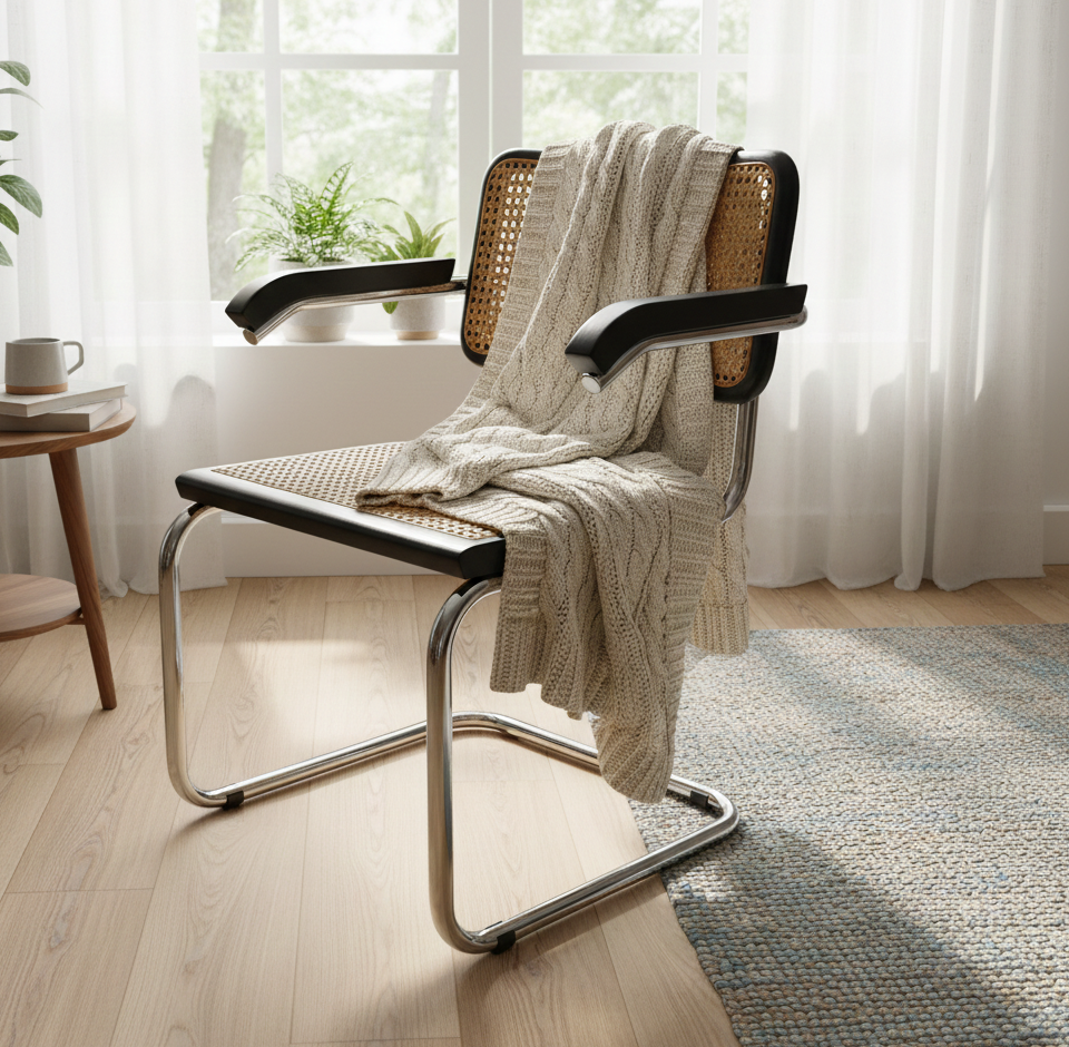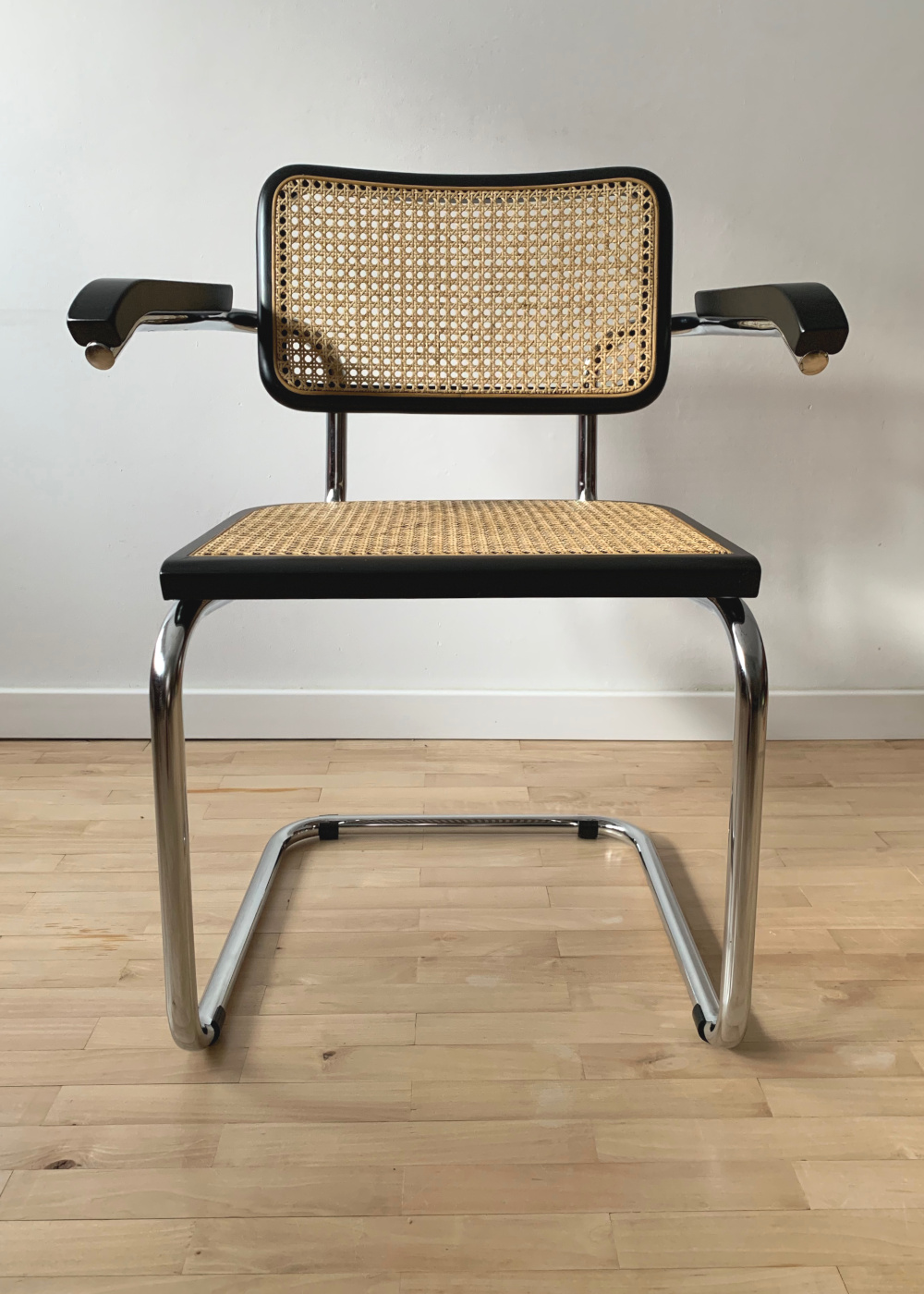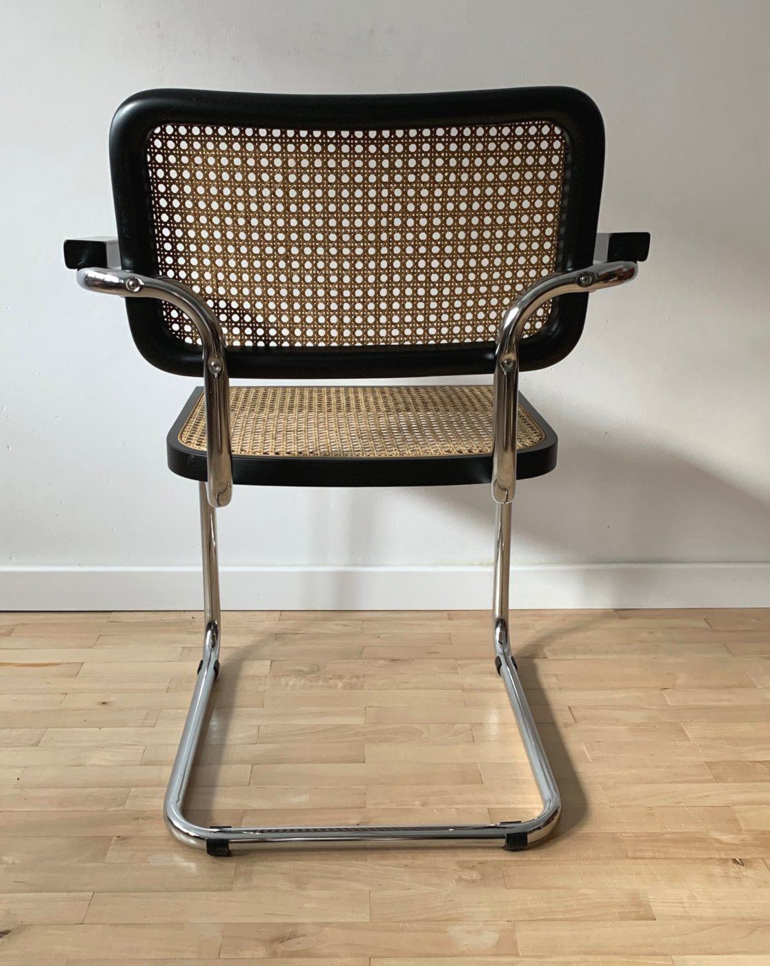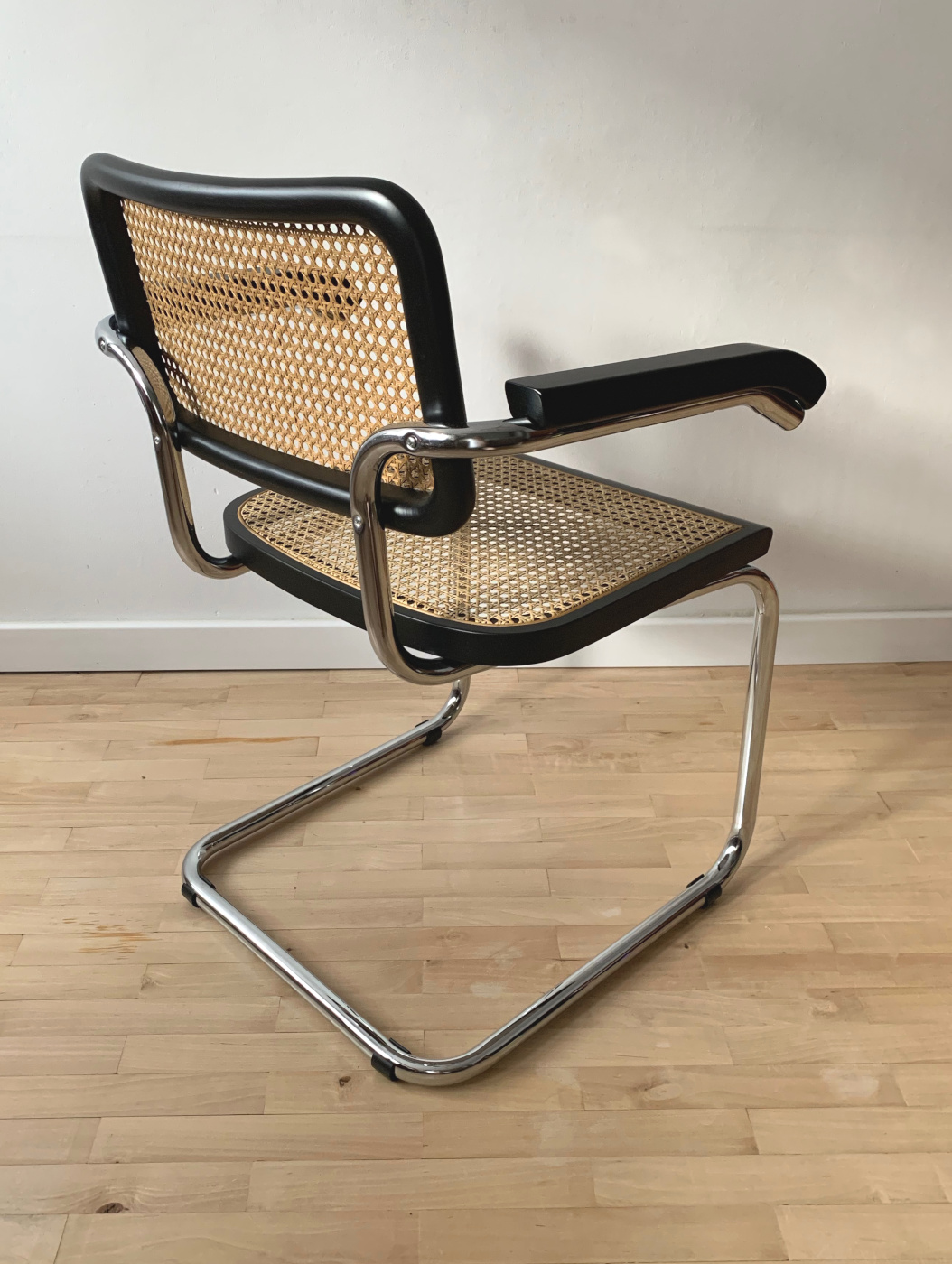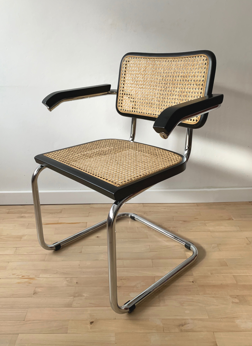 Krzesło w stylu Bauhaus, M. Breuer, model z podłokietnikami, rattan, rama drewniana, kolor czarny.